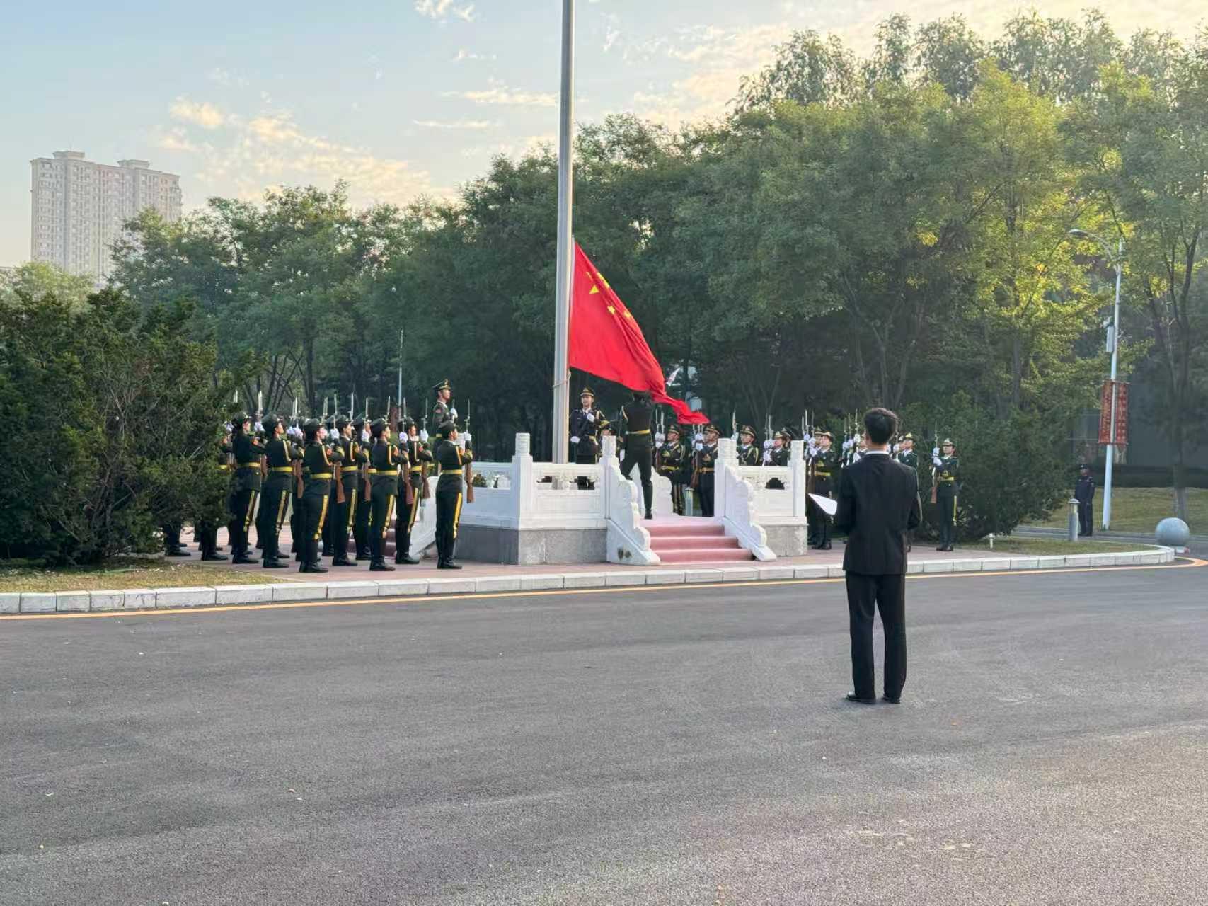 今年是中国人民抗日战争暨世界反法西斯战争胜利80周年,同时也是中华人民共和国成立76周年。当嘹亮的口号声响起,大学生国旗护卫队迈着铿锵有力的步伐,护送国旗入场。伴随着雄壮的《义勇军进行曲》,鲜艳的五星红旗冉冉升起。全体师生肃立,行注目礼,高唱国歌,表达对祖国的无限热爱与崇高敬意。